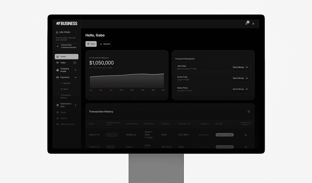 We support ACH transfers, wire transfers, stablecoin payments (USDC/USDT), MXN payments, and EUR payments. We can also make first-party SWIFT payments to over 50 countries.